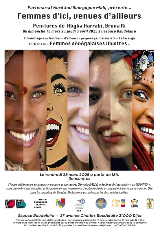 Djenaba Baldé présidente de l’association la téranga , accompagnée à la cora par Bâ, coriste sénégalais, partenaire de cet évènement, évoque les femmes illustres sénégalaises dont sont exposées les biographies, puis un poème de Senghor est lu par demba coulibaly, étudiant sénégalais à Dijon, Danielle Rhéty, de la téranga lit un extrait d’"Une si longue lettre", premier roman de l'écrivaine sénégalaise Mariama Bâ , accompagnés à la cora par Bâ, griot sénégalais vivant à Dijon, puis nous avons assisté à une performance réalisée par Hbyba , Cette performance est un hommage aux femmes tunisiennes, qui tissent, le coton et en font des tissus pour les vêtements et les tissus usuels de la vie courante, en en respectant toute la symbolique.